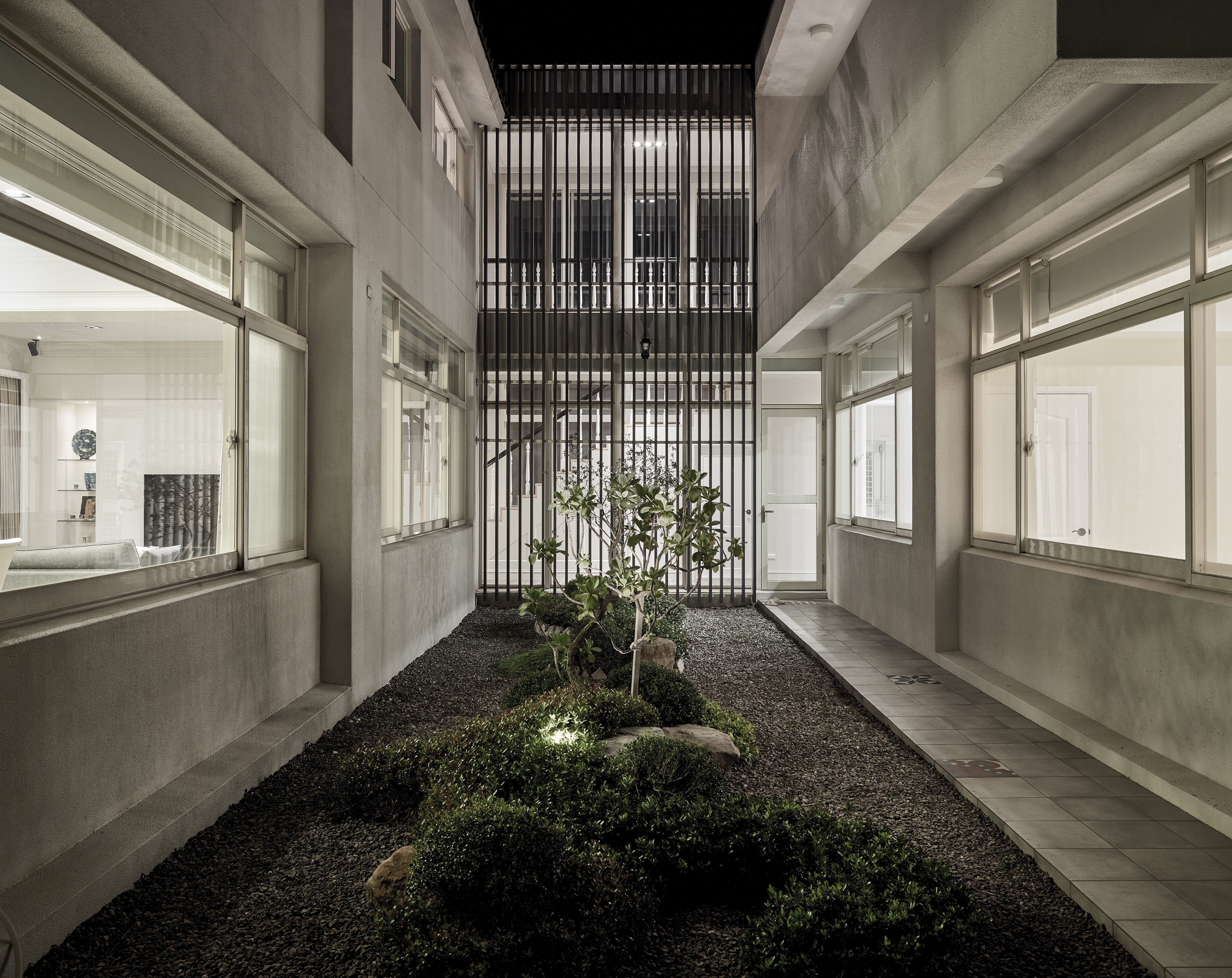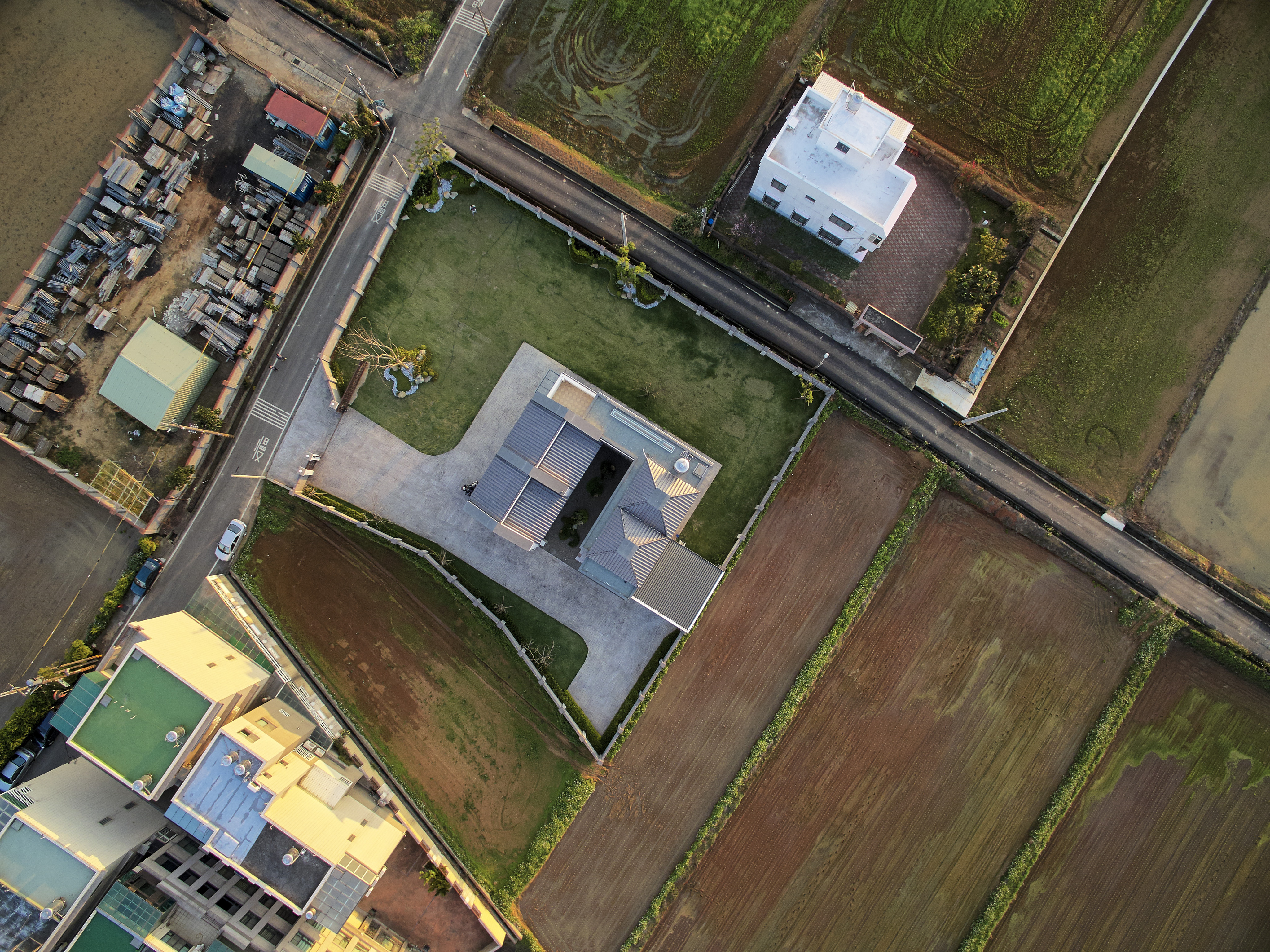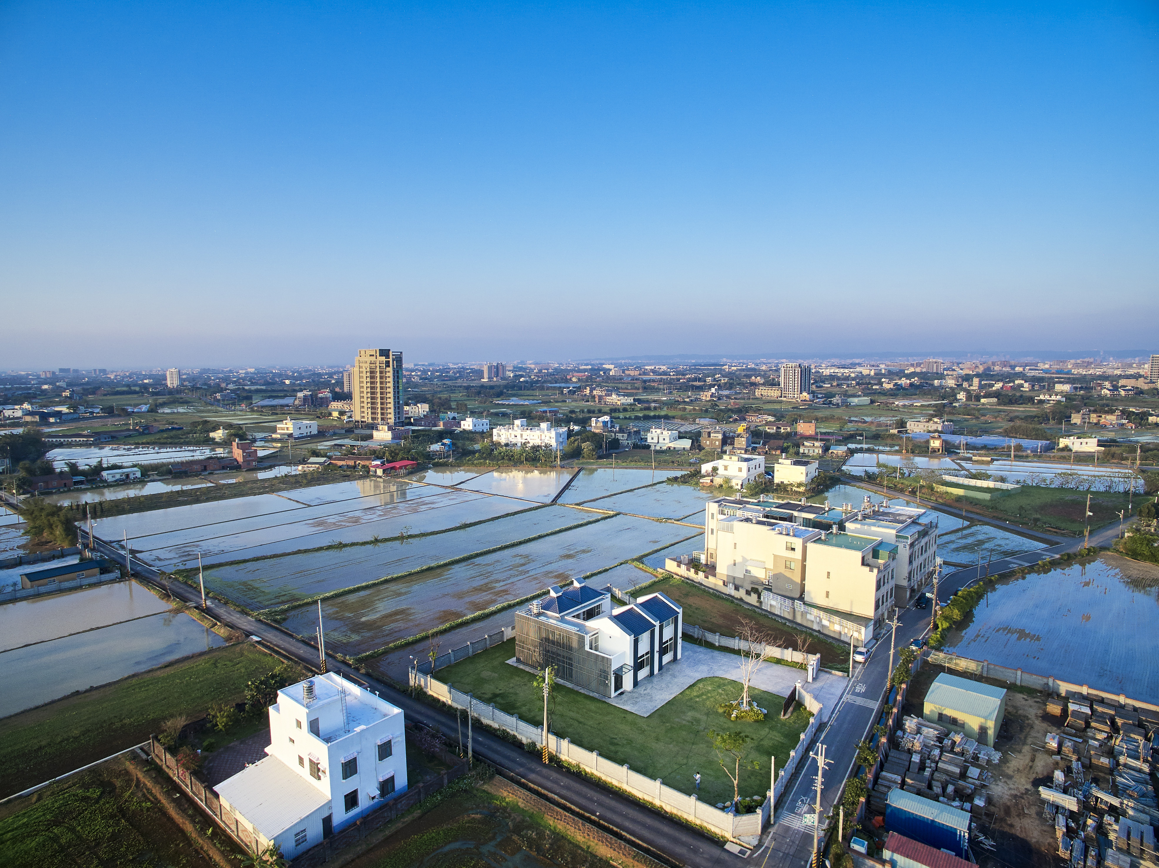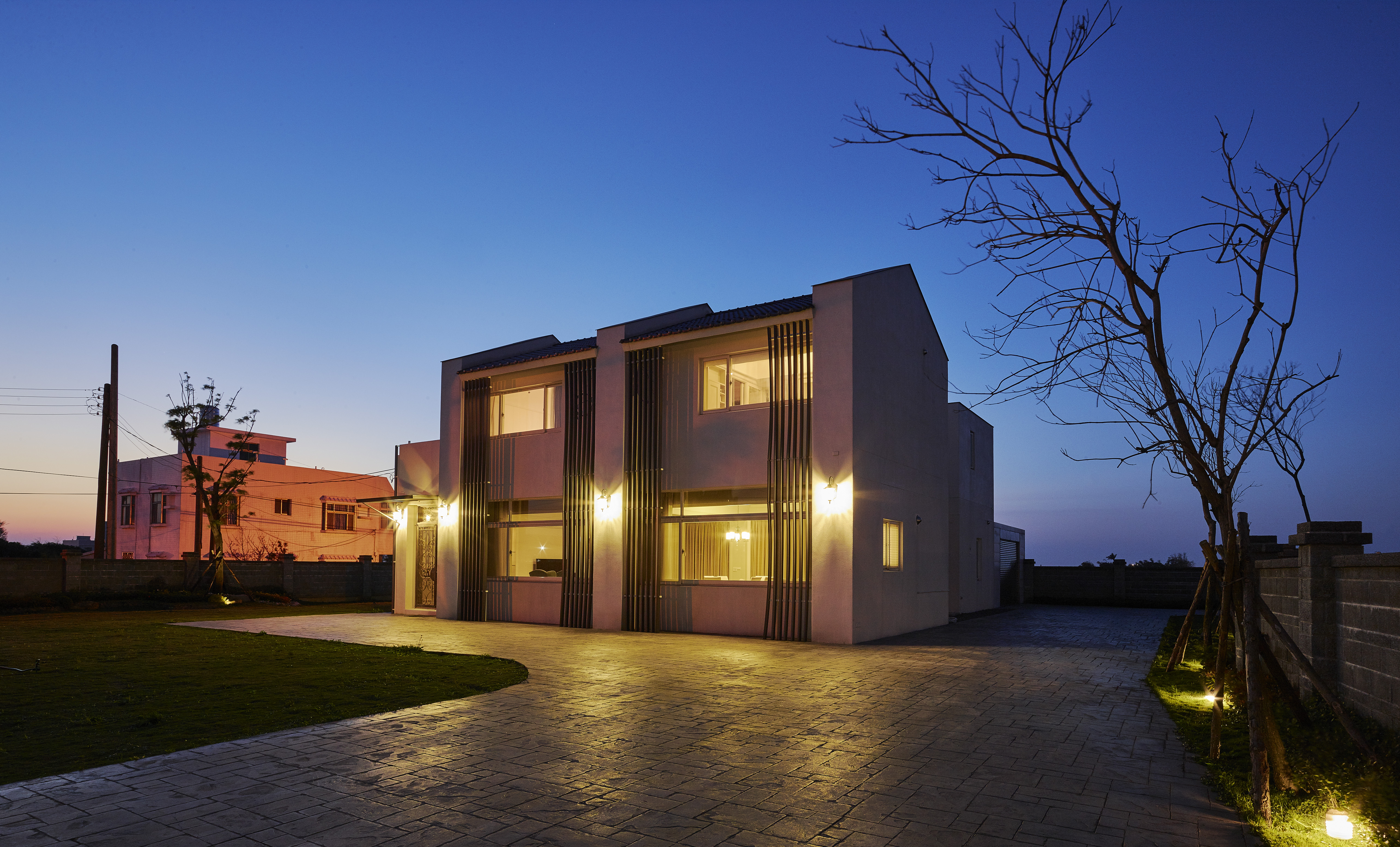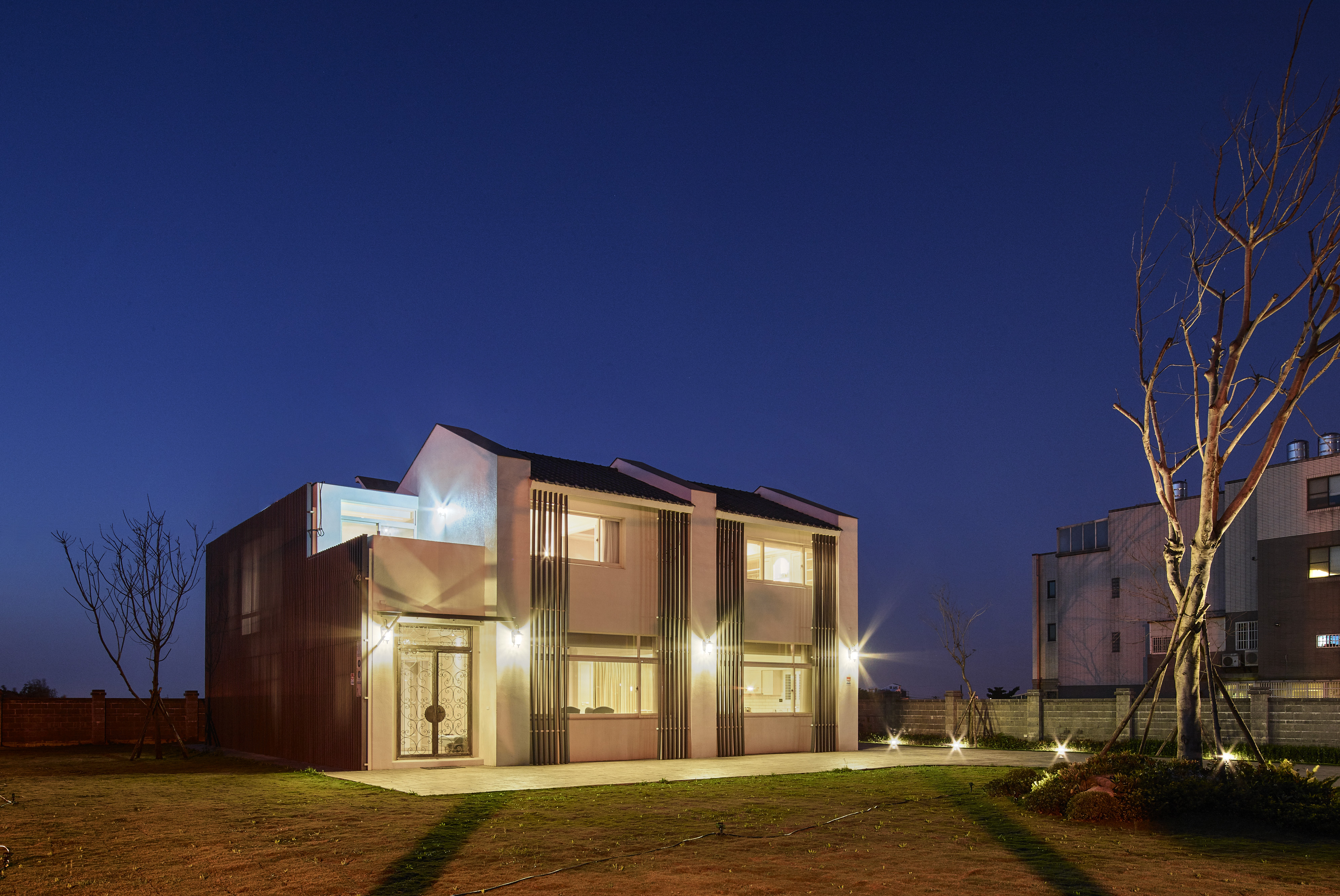 台灣在北回歸線二十三點五度,所以我們與太陽也存在著二十三點五度的夾角,南向可以提供給建築均勻的日照,所以我們把建築物分成兩棟,前棟為客、餐廳的公共空間,後棟為臥室較為私密的空間,前後棟用川廊連接,就可以讓業主擁有兩倍和煦的南向採光,北向因為地球與太陽夾角的關係,不會有直射光,太陽變成最大的間接光源,我們把建築物的屋頂面向北邊設計出高低落差的天窗及高窗,設計出有光沒有熱的採光方式,並且讓熱空氣可以向上對流,真的讓建築物達到最大的自然採光與通風,被動式的設計體驗真正生活在鄉間的自由與慢活
