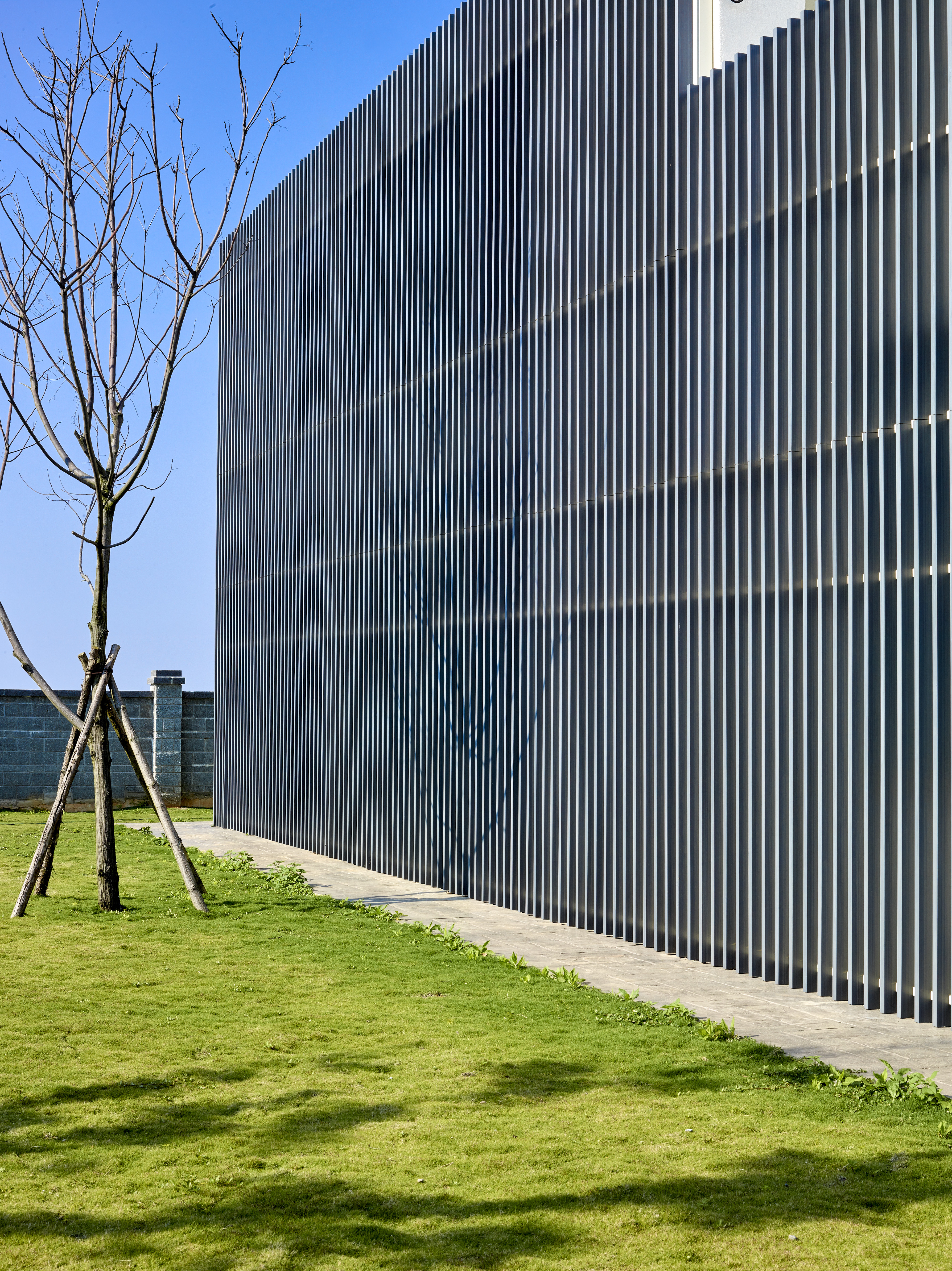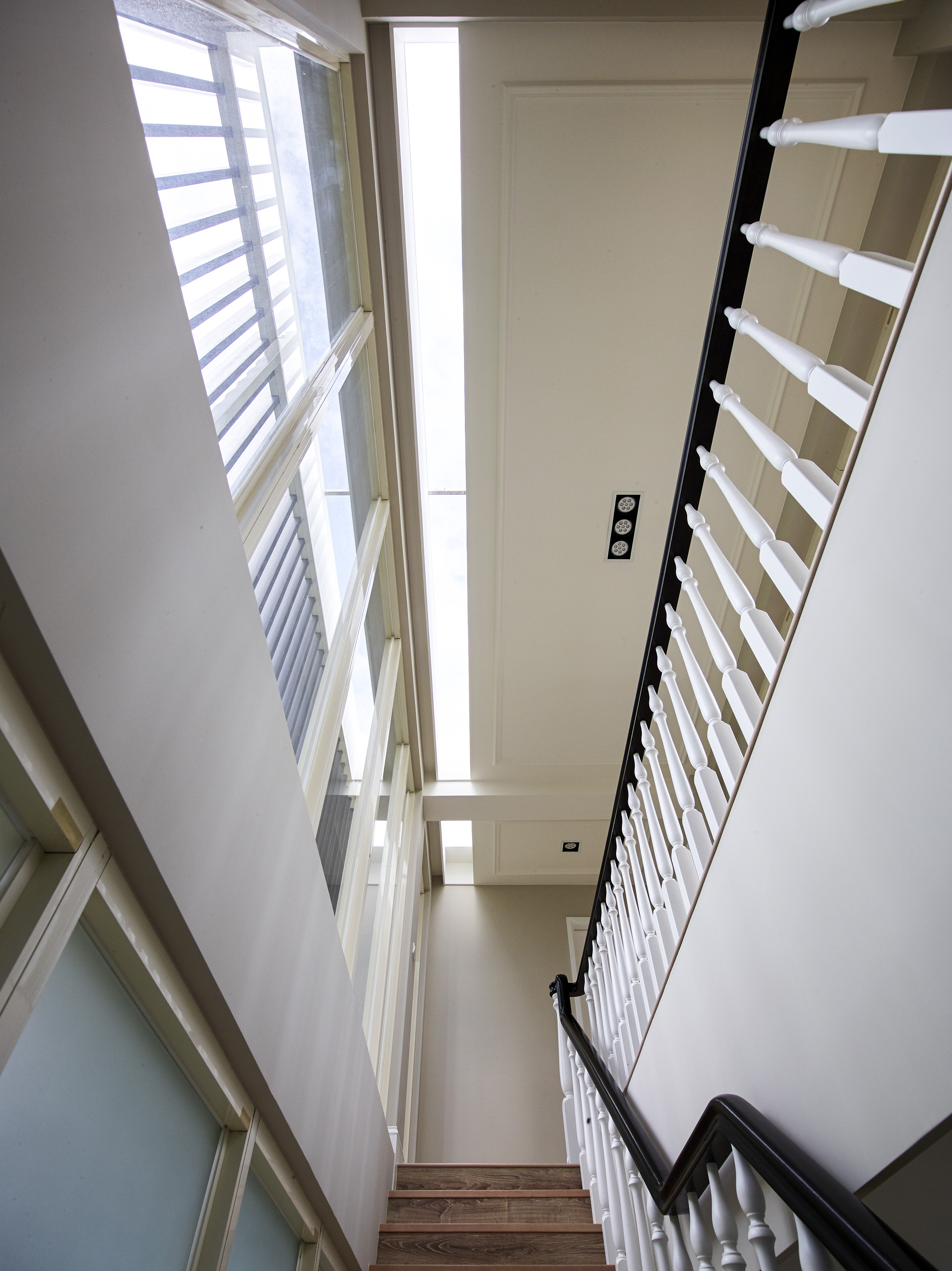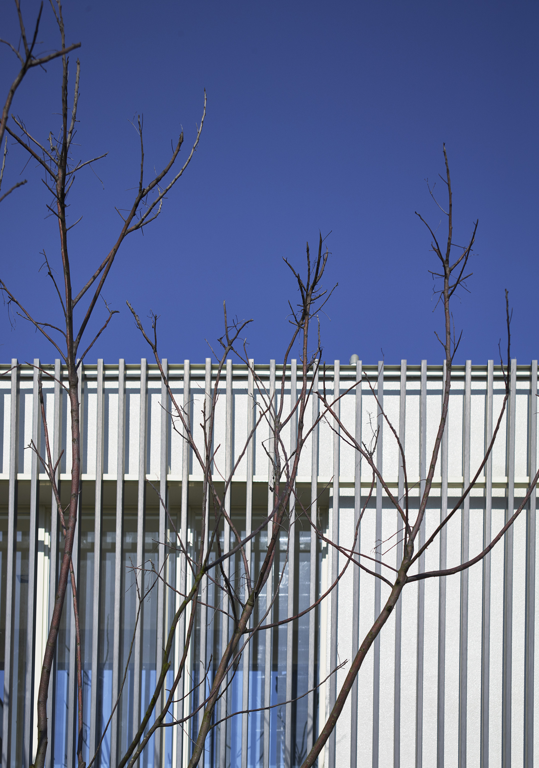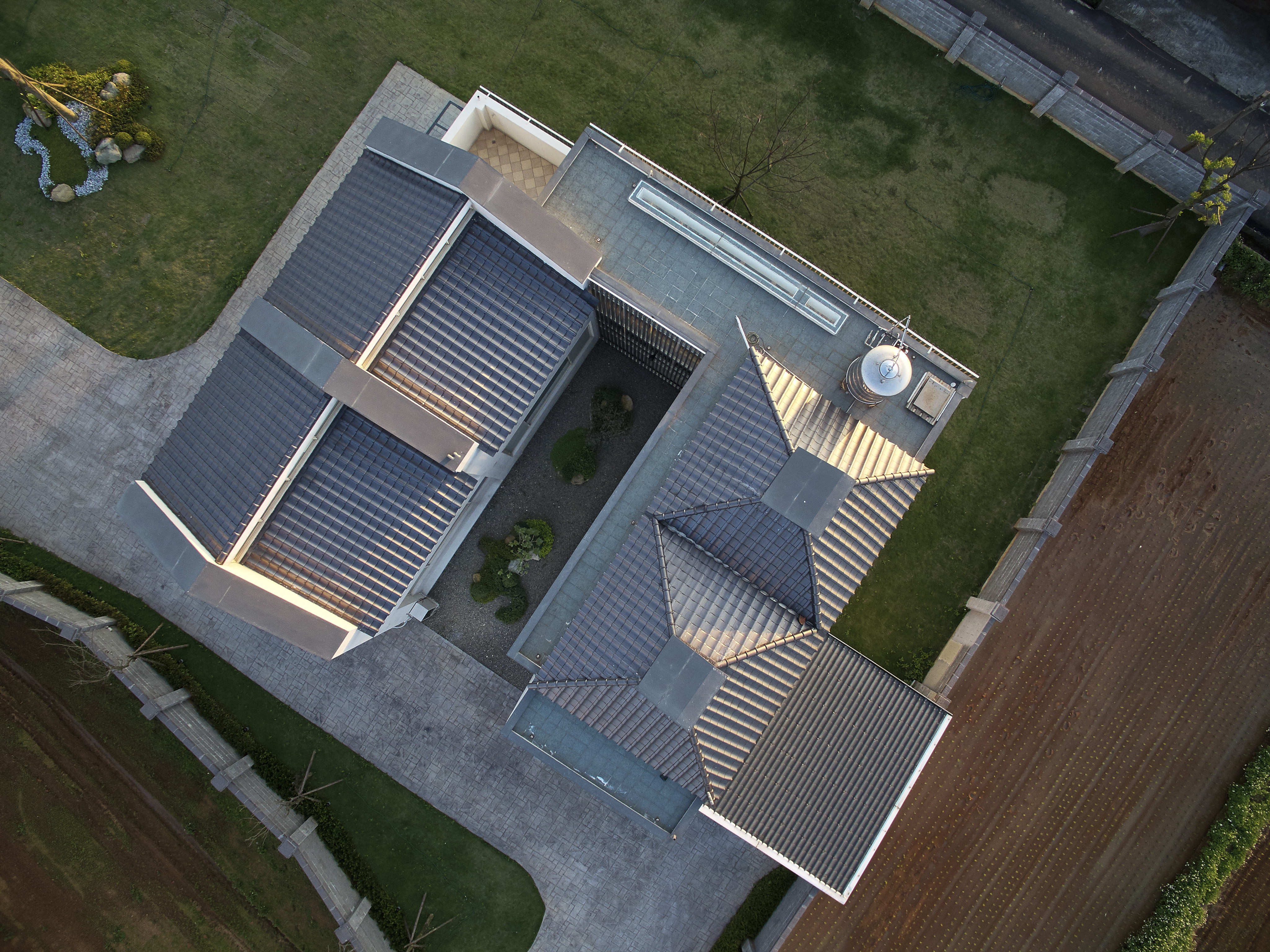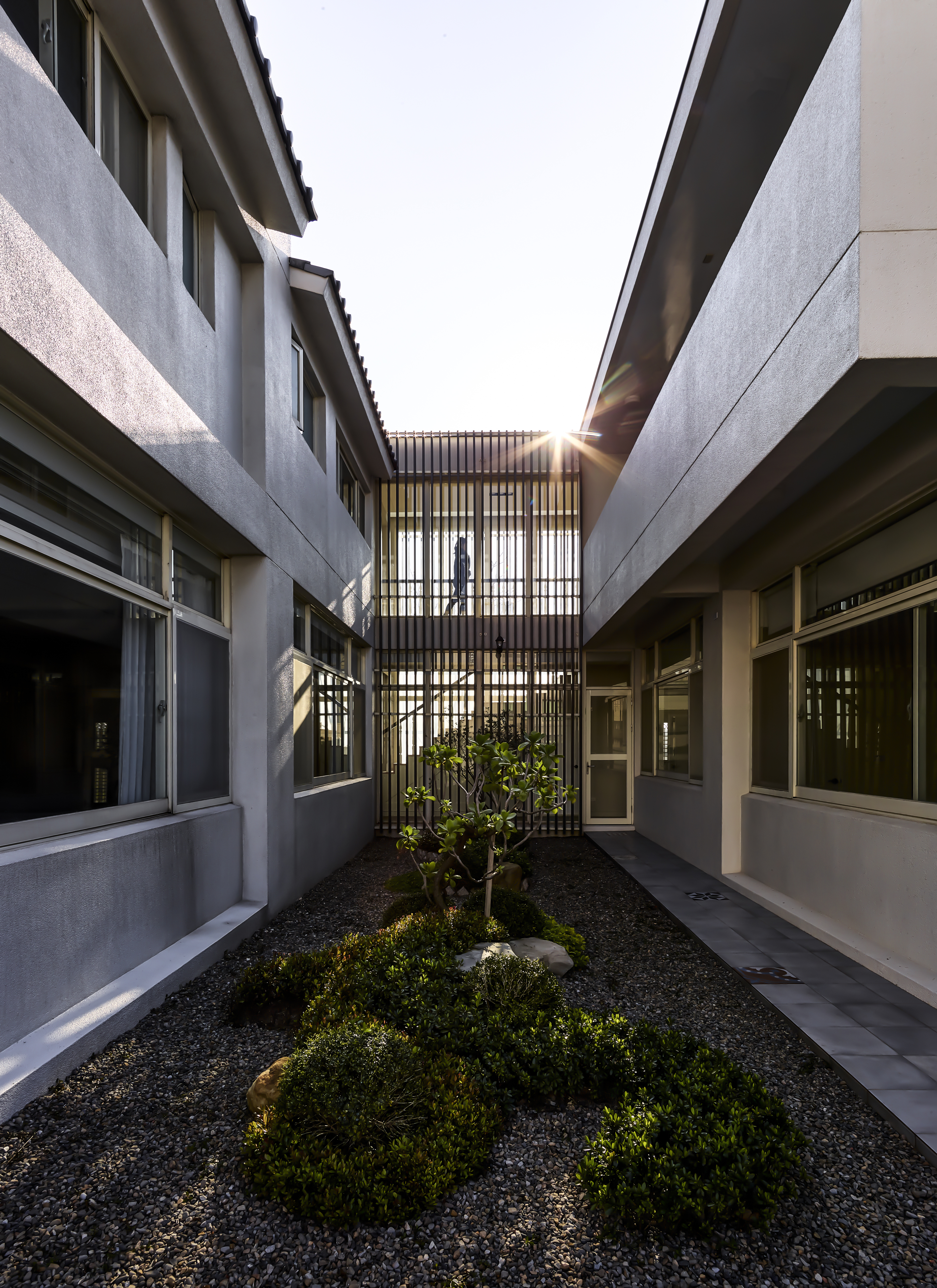 台灣在北回歸線二十三點五度,所以我們與太陽也存在著二十三點五度的夾角,南向可以提供給建築均勻的日照,所以我們把建築物分成兩棟,前棟為客、餐廳的公共空間,後棟為臥室較為私密的空間,前後棟用川廊連接,就可以讓業主擁有兩倍和煦的南向採光,北向因為地球與太陽夾角的關係,不會有直射光,太陽變成最大的間接光源,我們把建築物的屋頂面向北邊設計出高低落差的天窗及高窗,設計出有光沒有熱的採光方式,並且讓熱空氣可以向上對流,真的讓建築物達到最大的自然採光與通風,被動式的設計體驗真正生活在鄉間的自由與慢活